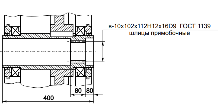 Размеры полого шлицевого тихоходного вала редуктора Ц2-400П МРЗ